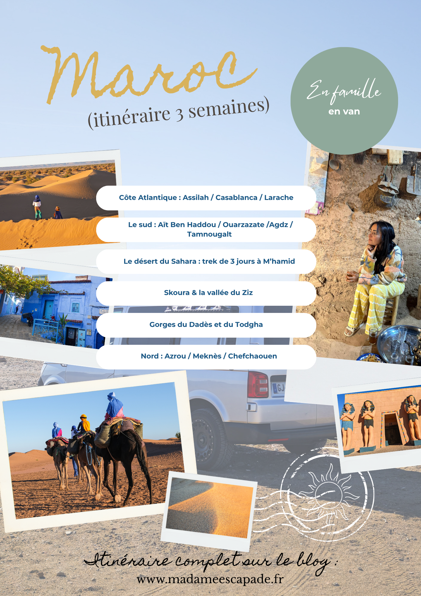 Se déplacer : nous avons voyagé en van. Pour stationner facilement, on a utilisé Park4night tout au long du séjour, la plupart des parkings sont gardés pour quelques dirhams, ce qui rend les arrêts bien plus sereins.